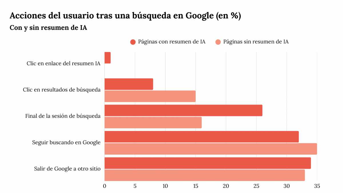 Como muestra el gráfico anterior, la presencia del resumen generado redujo drásticamente la probabilidad de que el usuario visite un resultado web. Según un estudio del Pew Research Center (con datos reales de marzo de 2025 y una muestra de 900 personas):
