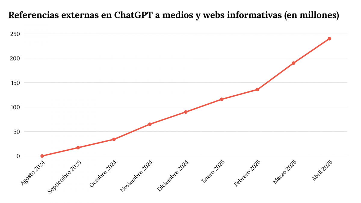 ChatGPT, en sus versiones iniciales, generaba respuestas sin proporcionar enlaces directos, lo que dificultaba el tráfico de referencia a sitios web. No obstante, desde mediados de 2024, incorporó funciones de búsqueda y enlaces a fuentes en sus respuestas. Esto ha llevado a un aumento significativo de visitas enviadas a páginas externas.