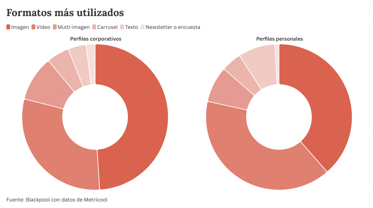 Si quieres impresiones en tu perfil de empresa, parece que el vídeo ya no es la mejor opción, cosa que seguramente se debe a que ya no es una novedad. De hecho, es el segundo formato más repetido, algo que puede llegar a causar fatiga.