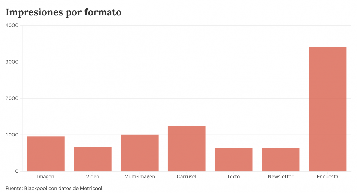 El gráfico muestra cómo, a pesar de que el formato multi-imagen y el carrusel acumulen más interacciones (por el aumento de clics), el algoritmo no lo llega a premiar con una gran subida en impresiones.